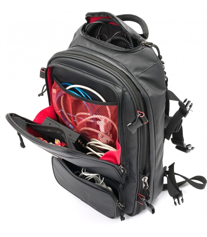 Esta mochila ha sido especialmente diseñada para el DJ viajero. Dispone de múltiples compartimentos.