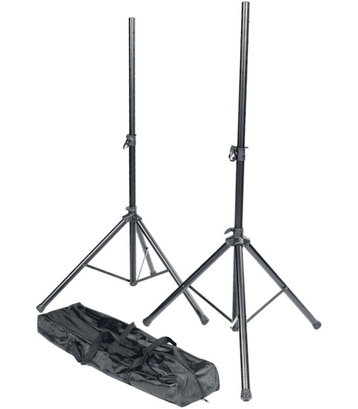 Pack compuesto por dos soportes para altavoces y una práctica funda.