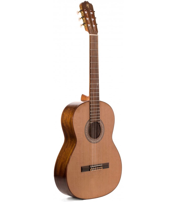 Guitarra clásica de estudio con tapa maciza de cedro, aros, fondo y diapasón de mongoy, mango de samanguila y puente de palosanto.