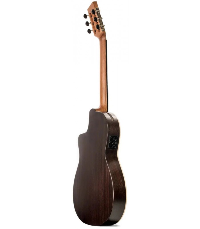 Impresionante guitarra de caja estrecha, tapa de pino abeto y aros y fondo de palosanto de India. Barniz mate de baja penetración. El mástil cómodo como pocos, es de tipo guitarra acústica, ligeramente más estrecho que una guitarra clásica y más delgado, con una configuración de 22 trastes. Además cuenta con amplificación y “portal de sonido”, una cavidad elíptica practicada en el aro superior que contribuye a reducir la confrontación de las ondas de sonido, haciendo que el instrumento sea más eficiente. Su especial construcción contribuye a eliminar los molestos sonidos de retro-alimentación cuando la guitarra está conectada a un amplificador. Tapa de Abeto Mastil de Cedro con refuerzo Ancho de Cejuela 47,85 mm Portal de sonido Cavidad en el aro para mayor proyección Sistema de previo Fishman Ink Aros y Fondo de Palosanto de India Barnizado en Mate de baja penetración Escala 650 mm