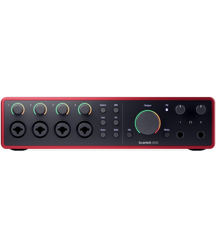 La scarlett 18i16 de cuarta generación está equipoada con suficientes E/S para conectar todo tu equipo y mezclar con salidas independientes. Ofrece cuatro preamplificadores transparentes y ultrasilenciosos y dos modos Air para obtener el sonido de una gran consola en cualquier lugar.