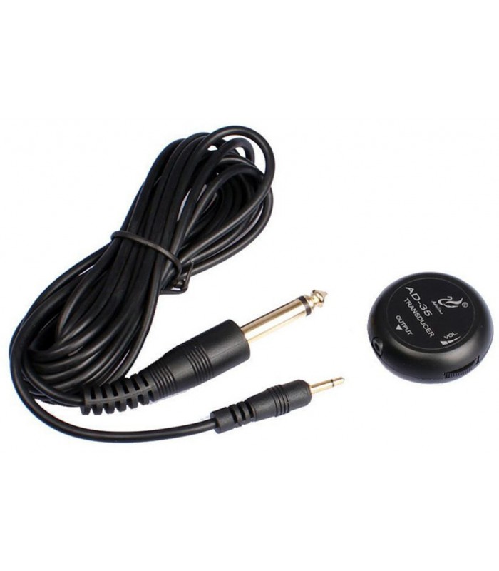 Pastilla piezoeléctrica con control de volumen para colocar en la tapa de instrumentos acústicos como guitarra, banjo, ukelele o violín.